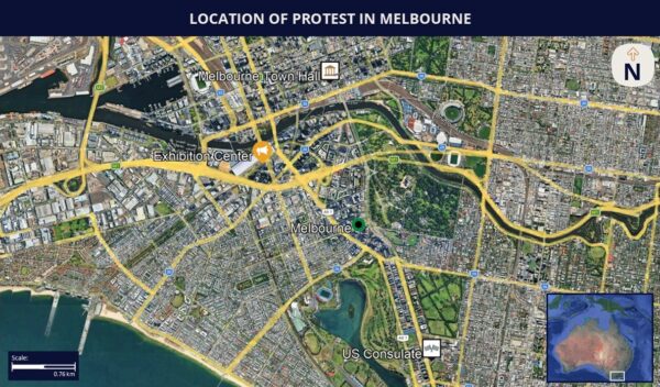 Those operating or residing in Melbourne on January 29 are advised to maintain vigilance in the vicinity of the aforementioned location due to the slated protest and associated risk of scuffles, while allotting for travel disruptions.