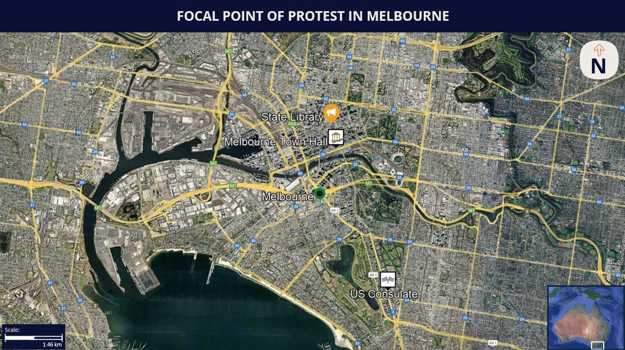1. Turnout at the slated protest in Melbourne is likely to range between the mid-to-high dozens, based on the resonance of the conflict in the city. The authorities are expected to bolster security measures in the vicinity of the State Library as part of the standard security protocol. These measures will include the deployment of police personnel and installation of barricades to monitor the proceedings.