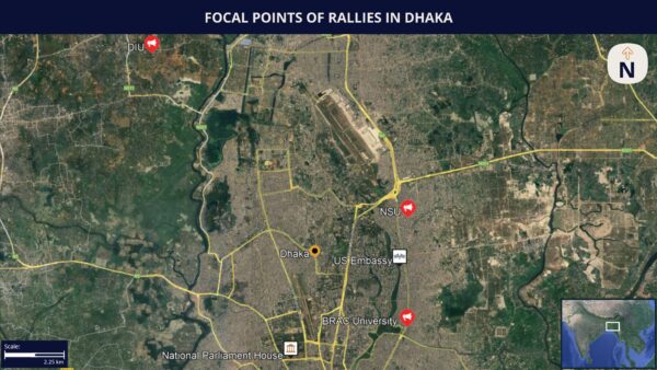 - The turnout at the slated gatherings is expected to range in the low-to-mid hundreds, given PUSAB’s strong mobilizing capacity and the symbolic significance of expressing support for the verdict against ousted PM Hasina. The authorities are likely to adopt heightened security measures around BRAC University, DIU, and NSU, including the deployment of police personnel, riot control units, Rapid Action Battalion (RAB), and the installation of barricades to regulate movement and prevent escalations. Similar bolstered measures are anticipated outside the key government buildings and prominent locations, including the Bangabandhu Memorial Museum, considering the localized clashes witnessed between the police and anti-AL protesters in Dhanmondi 32 on November 17.