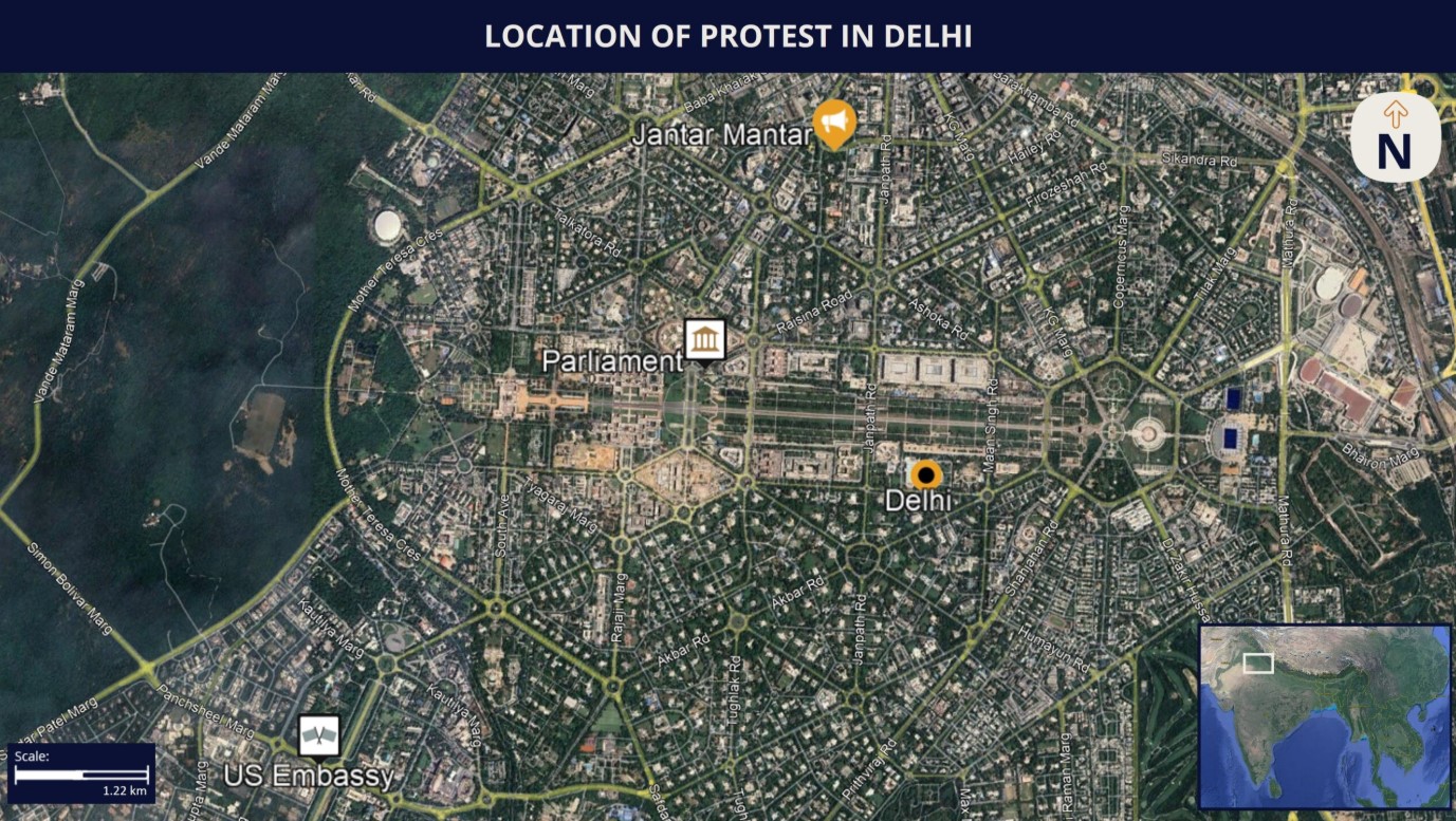 - There remains a latent risk of localized skirmishes between the police and the protesters if the latter are perceived as engaging in unruly behaviour such as blocking major roads or breaching security cordons. In such a case, the authorities will likely respond with measures like temporary detention and forced removal of the protesters from the site. Localized pedestrian and vehicular traffic disruptions are expected in the vicinity of Jantar Mantar during the scheduled protest hours on January 3 due to anticipated turnout and associated security measures.