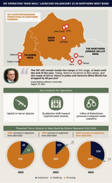 2. The IDF campaign, dubbed “Operation Iron Wall,” began in Jenin and expanded to incorporate major terrorist strongholds in the region (mainly refugee camps), including Tulkarm, Tubas, and Nablus. It marked a shift in the strategy adopted by Israel’s security apparatus, with Defense Minister Israel Katz authorizing the permanent presence of Israeli troops and the evacuation of the population from these locales until the end of the year at least. The decision to expand the scope of the campaign, which included the first entry of IDF tanks to the West Bank since the Second Intifada, was likely informed by a resurgence of militant activity after previous major IDF operations in Jenin in July 2023 and August-September 2024, suggesting that these were insufficient in providing a long-term solution to the recurring threat.
