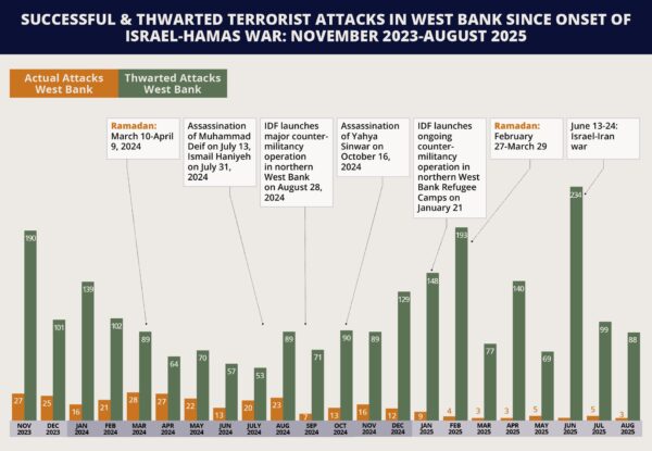 3. More broadly, a comparison of the yearly militant trends in the West Bank (see below) explicitly demonstrates a sustained and significant rise in militants’ motivation since 2021. The number of thwarted attacks in the region in the first eight months of 2025 (1,048) has already exceeded the total recorded throughout 2024 (1,040). This constitutes a record high in four years, reflecting a nearly 200 percent increase from the number of thwarted attacks in 2021 (351). The upward trajectory is likely reflective of multiple factors, including several rounds of conflict between Gaza-based militant groups and Israel, most notably the Israel-Hamas war since October 2023, anti-PA sentiments, the prolonged socioeconomic crisis in the region, and Iranian funding. It underscores the limitations of Israel’s counter-militancy strategy overall, which fails to address the aforementioned root causes of terrorism in the West Bank, resulting in the continued desire among Palestinians to resort to terrorism.