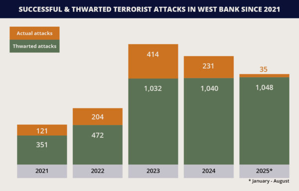 4. Although the number of successful attacks is on track to reduce from the record high in 2023 (414), with only 35 attacks recorded so far in 2025, there is continued evidence that terrorists retain the means to advance terror activity, including in the northern West Bank. This has included producing and planting explosive devices. For example, militants in the Tulkarm area planted explosives near the Nitzanei Oz Crossing on September 11 and on an IDF vehicle operating in the area on September 15