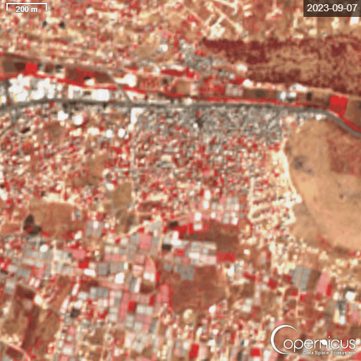 Time-lapse of satellite imagery depicting changes in northern West Bank refugee camps (1- Jenin Camp, 2- Tulkarem Camp, 3- Nur Shams Camp): 2023-2024