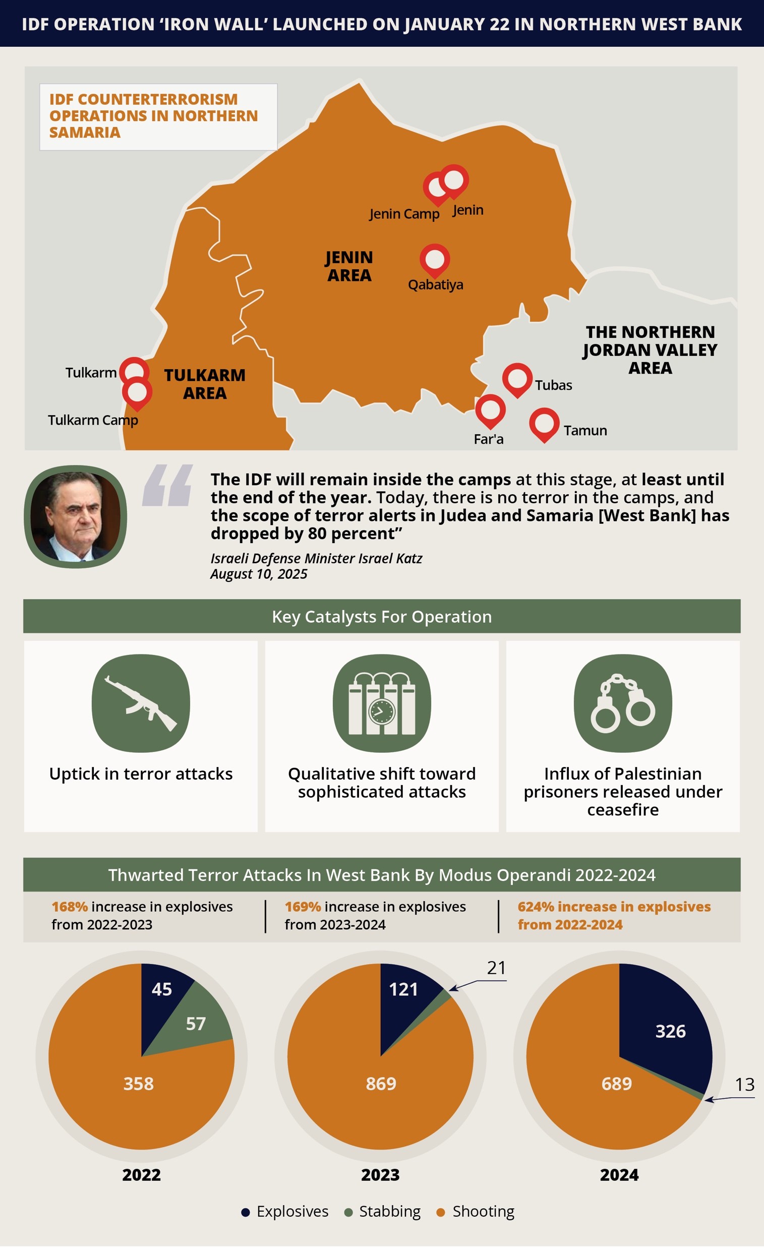 1. Despite Defense Minister Israel Katz’s statement on August 10 that terrorism in the West Bank has reduced by 80 percent since the IDF campaign began, several trends reiterate the persistent threat in the region. This is underpinned by militants’ continued motivation and means to conduct attacks.