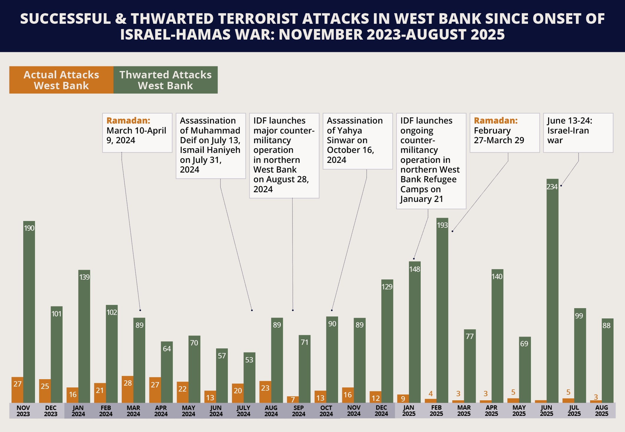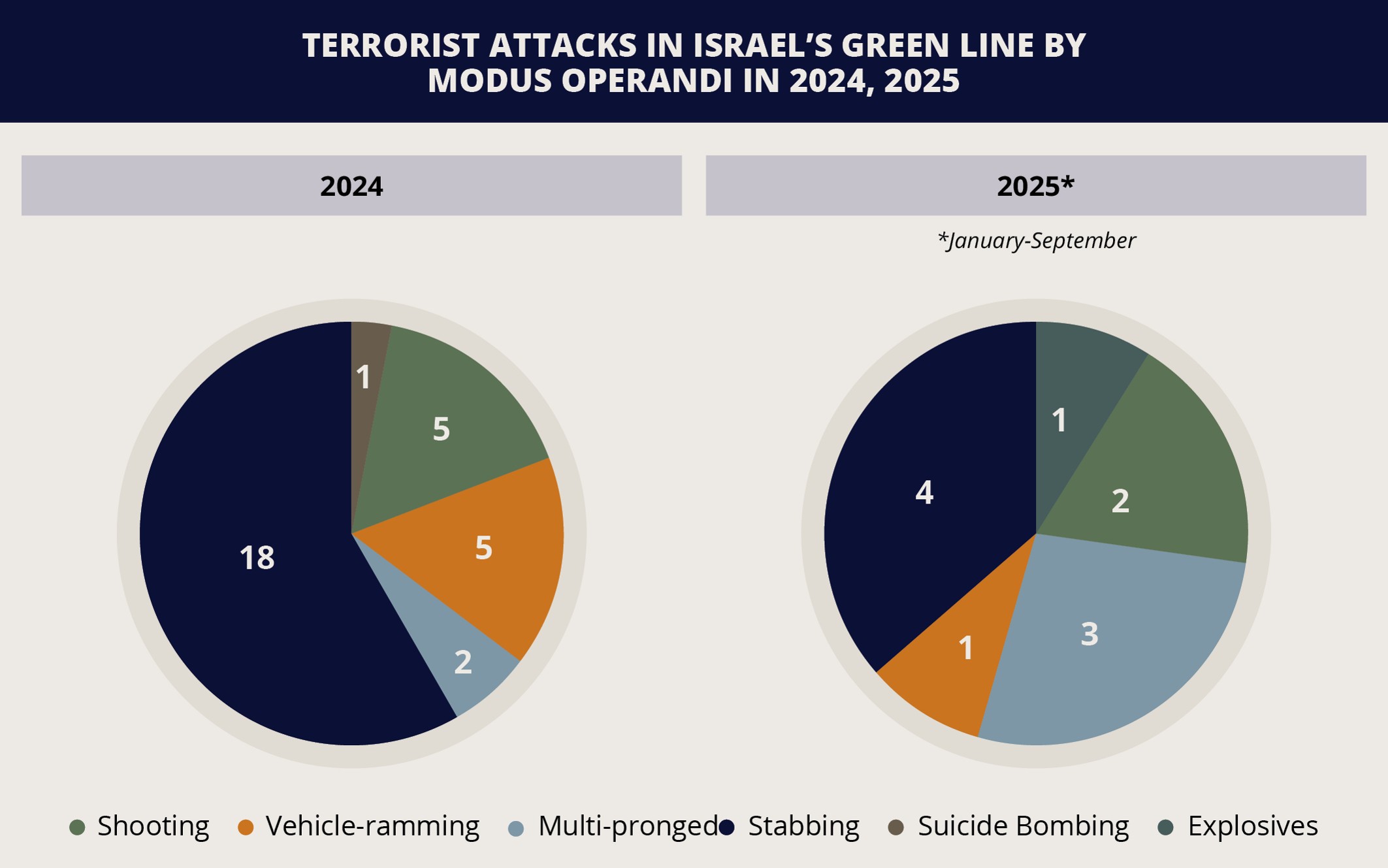 4. Although the number of successful attacks is on track to reduce from the record high in 2023 (414), with only 35 attacks recorded so far in 2025, there is continued evidence that terrorists retain the means to advance terror activity, including in the northern West Bank. This has included producing and planting explosive devices. For example, militants in the Tulkarm area planted explosives near the Nitzanei Oz Crossing on September 11 and on an IDF vehicle operating in the area on September 15