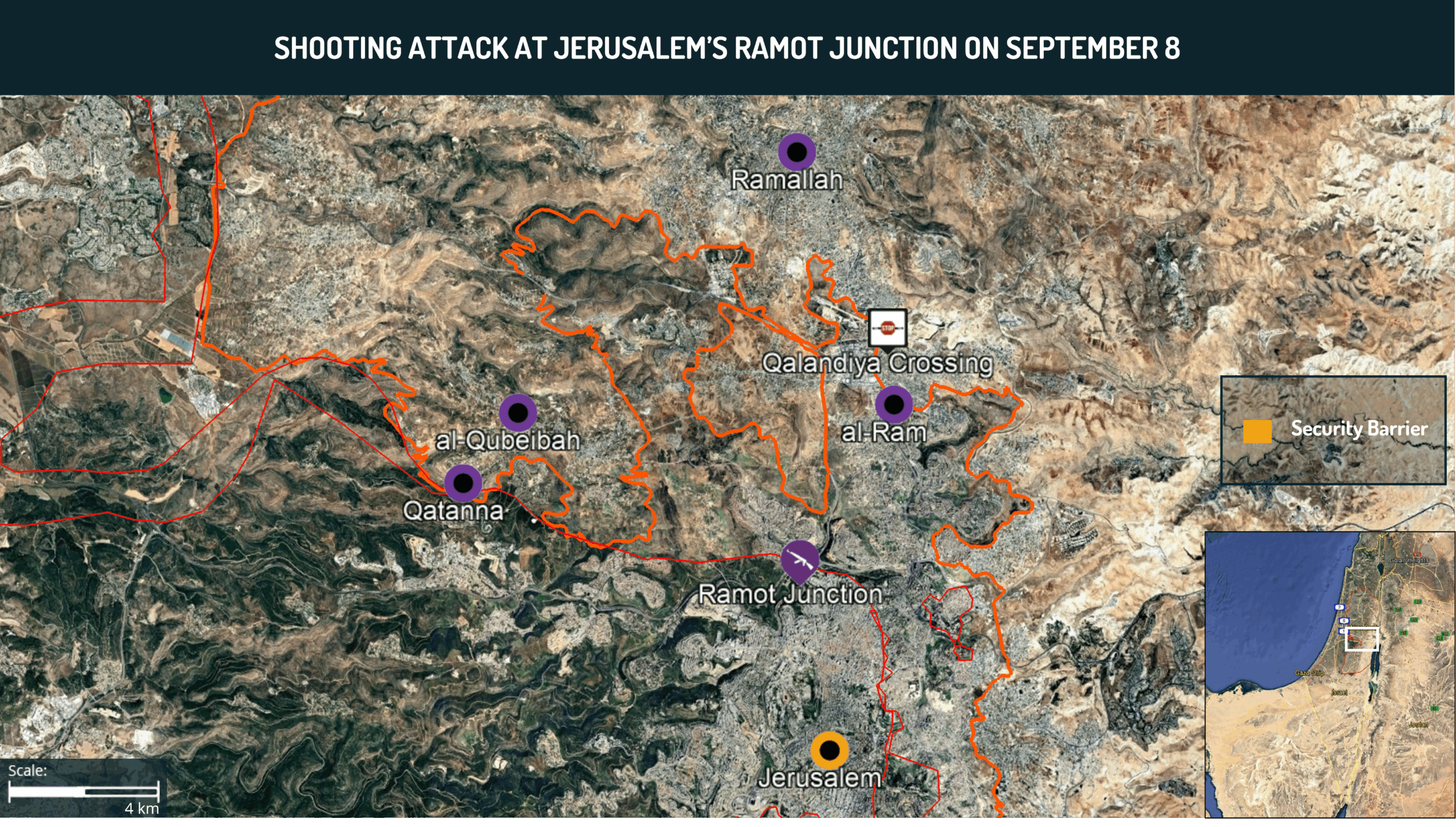 • On September 8, two Palestinians opened fire at a bus stop at the Ramot Junction in northern Jerusalem. Six individuals were killed and 12 were wounded. The suspects, from Qatanna and al-Qubeibah (south of Ramallah), reportedly infiltrated the security barrier around al-Ram.