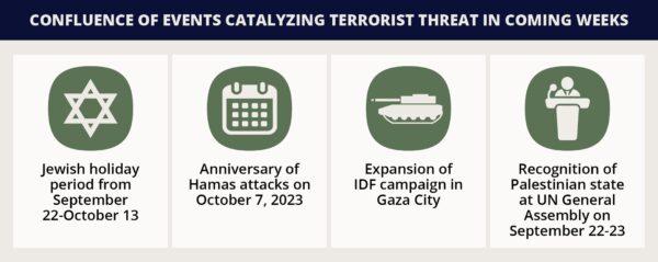 • A confluence of events, including the Jewish holiday period, the second anniversary of the Israel-Hamas war, the IDF’s Gaza City operation, and the recognition of a Palestinian state by multiple Western nations, will increase the terror threat in the region over the coming weeks.