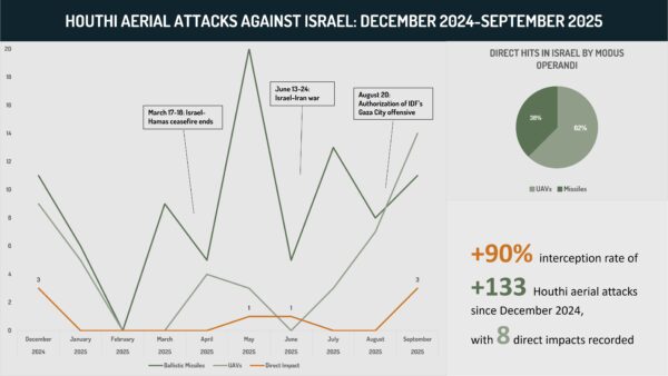 - Additionally, as indicated by the failed missile launch shortly after the UAV attack on September 24, the Houthis may be facing greater operational challenges in deploying this modus operandi, potentially due to repeated Israeli targeted airstrikes on the group’s military infrastructure, including weapon storage facilities, and the sustained efforts by the Presidential Command Council (PCC)-led forces in Yemen to intercept weapons transfers from Iran.