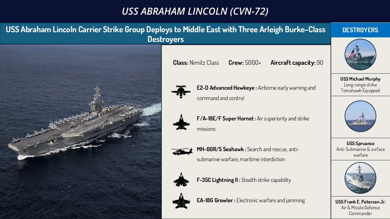 - On January 26, US Central Command (CENTCOM) confirmed that the USS Abraham Lincoln Carrier Strike Group (CSG) has been deployed in its area of responsibility.