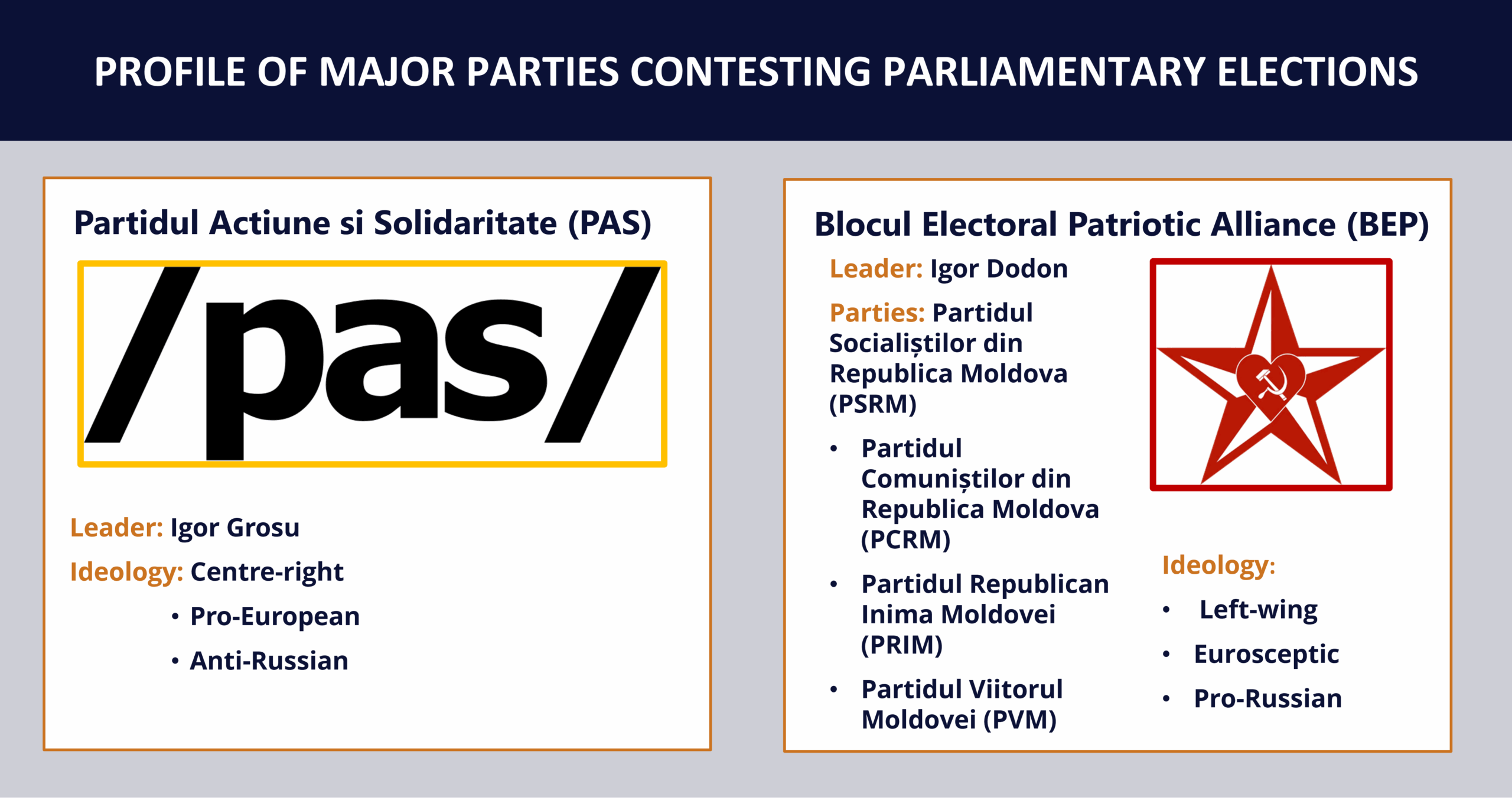 - The key contesting parties include the center-right, pro-EU Partidul Actiune si Solidaritate (PAS) party, as well as the left-wing pro-Russian electoral alliance Blocul Electoral Patriotic (BEP), led by the left-wing pro-Russia Partidul Socialistilor din Republica Moldova (PSRM).