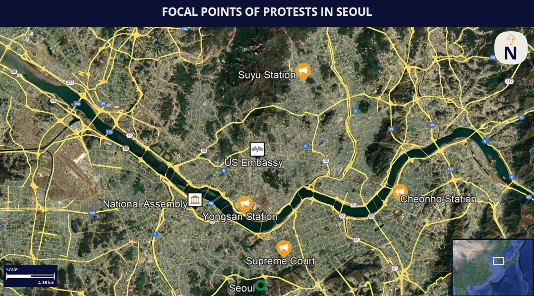 - There remains a latent risk of localized scuffles between protesters and the police, should the former resort to unruly behavior such as breaching security protocols. The risk of inter-group scuffles will slightly be elevated should pro-Yoon bystanders engage in impromptu counterprotests. The police are likely to employ crowd control measures, such as forced removal from site, should any unrest occur. The likelihood of law enforcement using force against protesters remains low considering the heightened public scrutiny over police conduct towards protesters. Localized travel disruptions are anticipated in the vicinity of the aforementioned locations during the protest hours on May 1-2 due to the anticipated turnout and associated security measures.