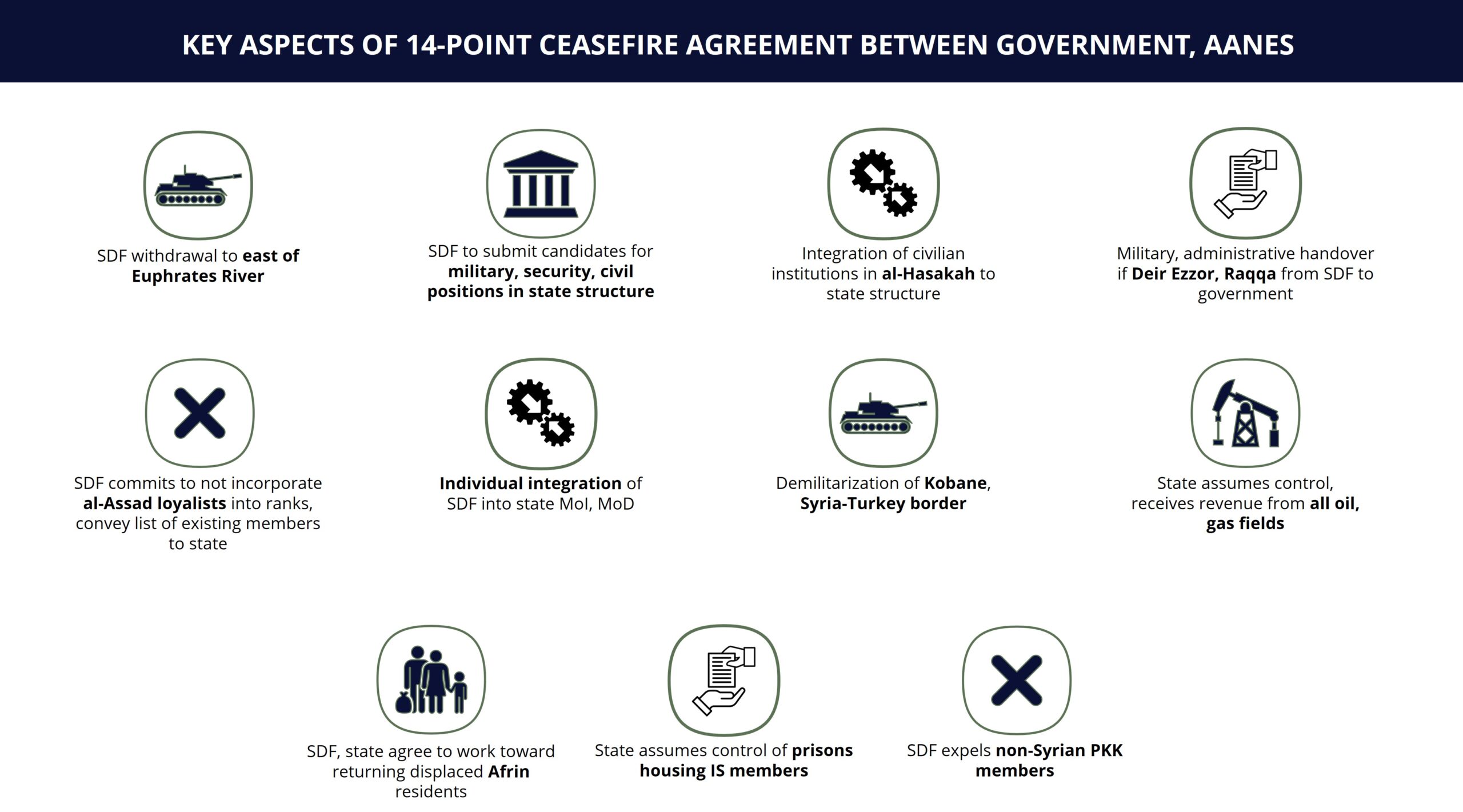 - Syrian Democratic Forces (SDF) commander Mazloum Abdi confirmed the agreement in a televised address. He stated that the latest armed conflict, which was “planned by many sides,” was imposed on the SDF. Abdi stated that the SDF would insist on “protecting the gains of the revolution.”